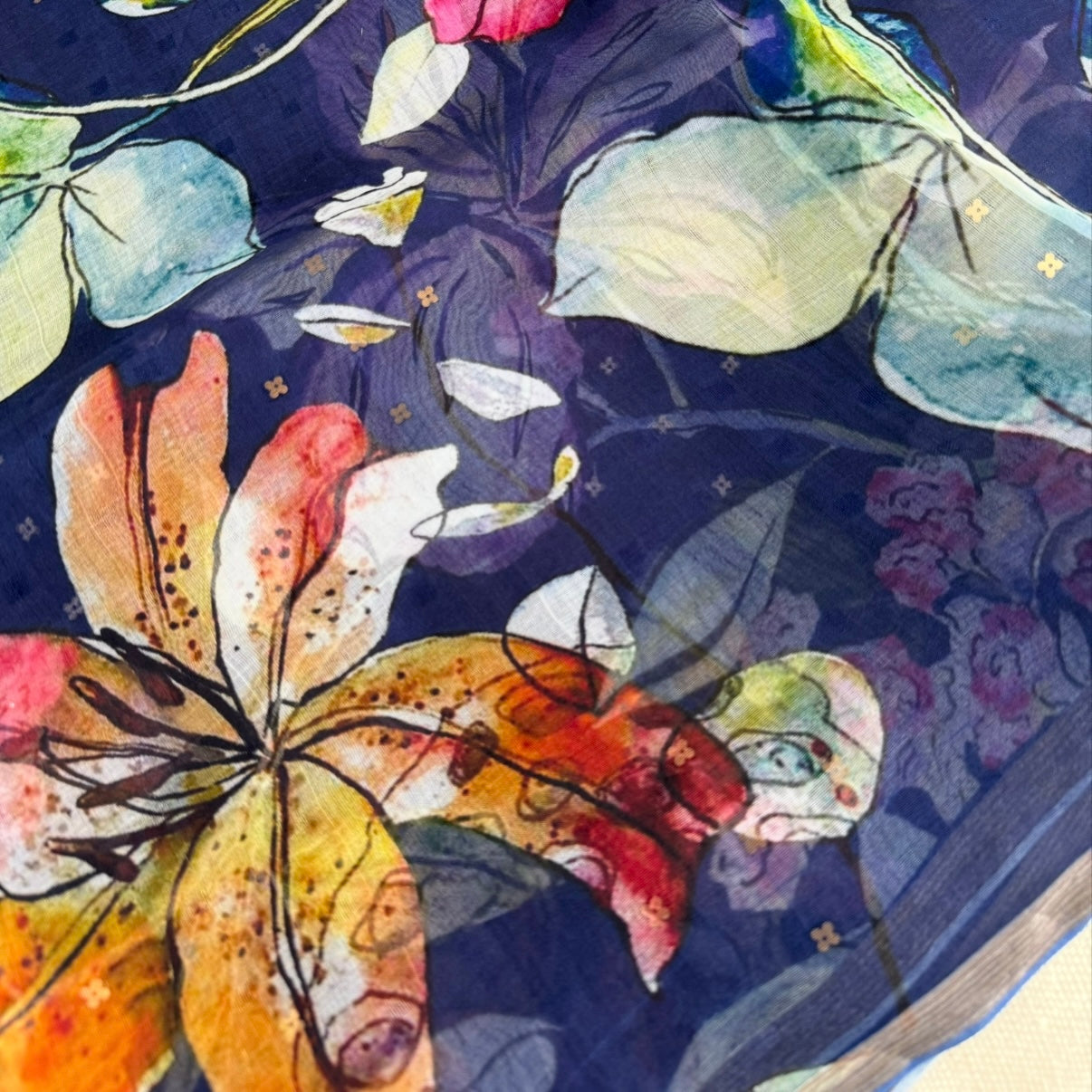 Dark Blue Floral Digital Printed Muslin Sequin Silk