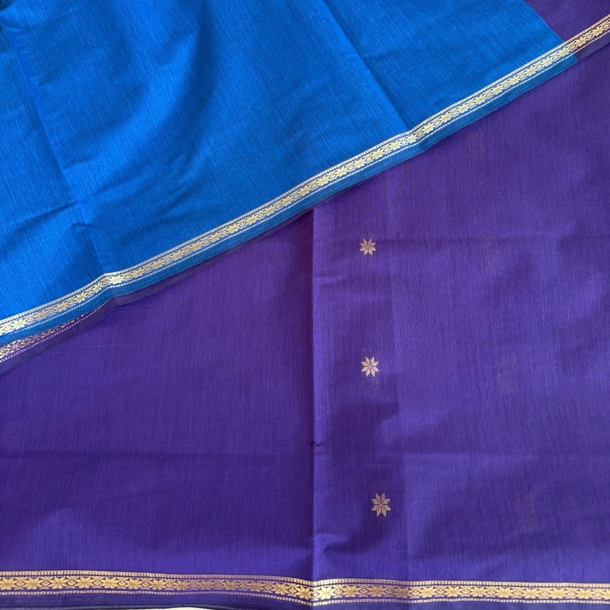 This Dark Blue cotton saree features golden star -floral borders and a contrast Sky blue pallu and blouse.