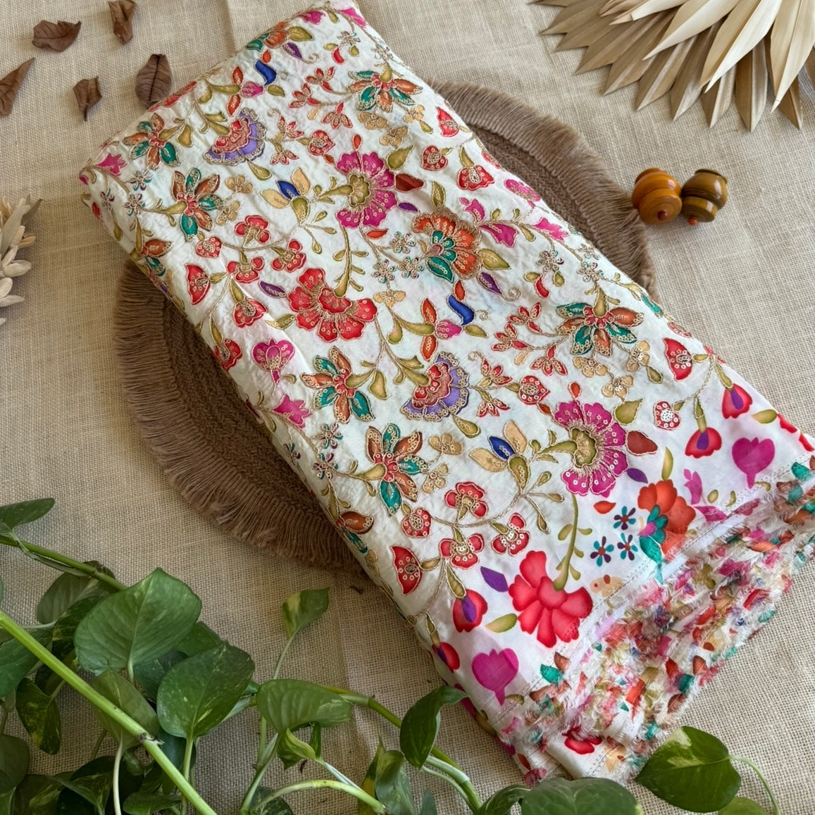 Bring festive elegance to your saree look with this multicolour embroidered blouse fabric. The fabric features intricate paisley and floral motifs crafted in vibrant shades of orange, red, green, pink, and gold on a soft white base, highlighted with zari and fine threadwork. Perfect for festive saree blouses.