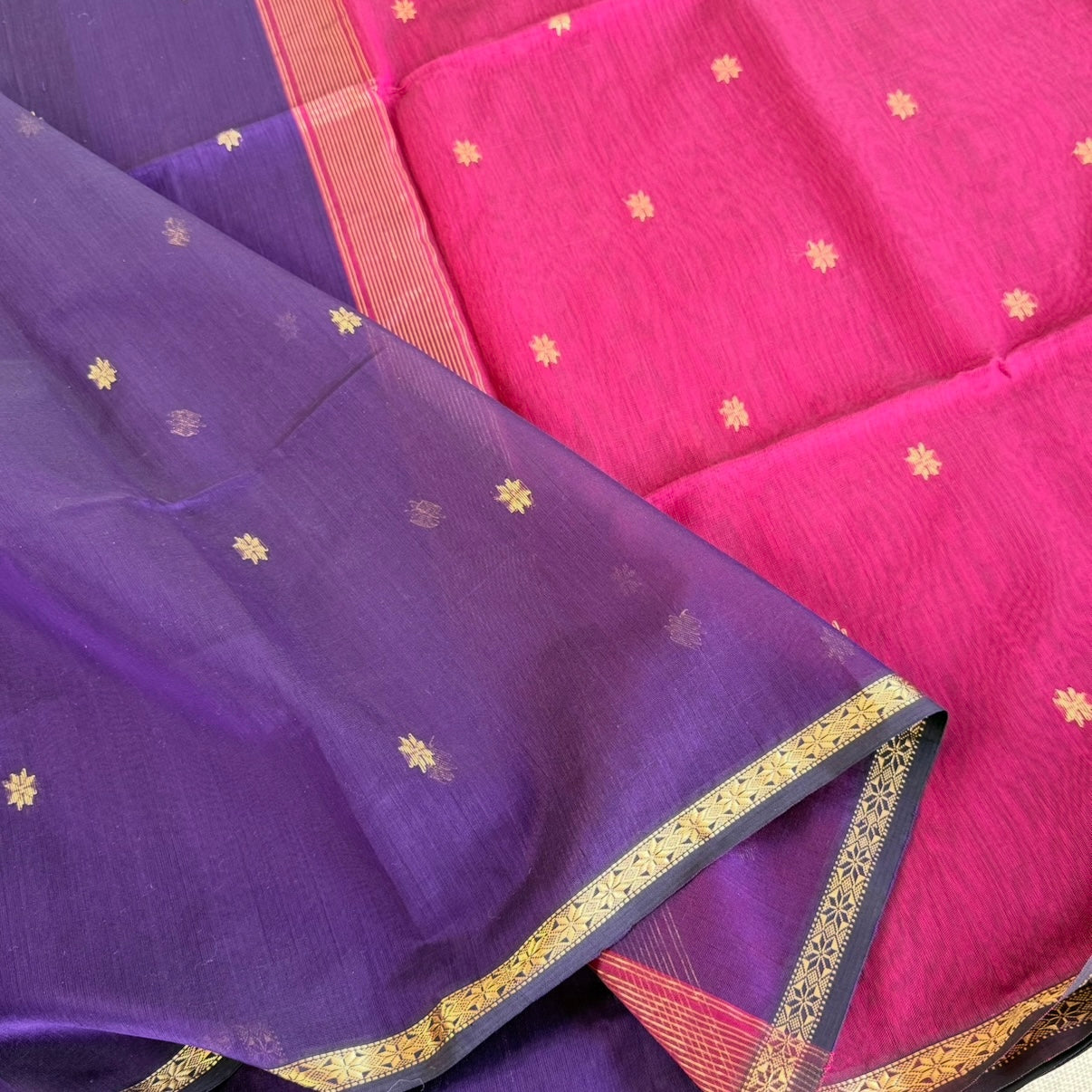 Graceful Purple Maheshwari silk cotton saree with a pink pallu and blouse, accented by delicate gold zari butta motifs.
